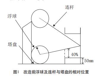 自我公司常減壓裝置投用以來,由于儀表安裝位置設(shè)計(jì)得不合理,儀表開孔位置距離塔盤太近,僅為50mm,致使減壓塔中部溢流槽液位儀表無法正常使用,測量范圍小。為了滿足工藝要求,進(jìn)行問題原因和解決方法分析與改造實(shí)踐。在本次改造前,浮球及連桿與塔盤的相對位置如圖1所示。由于受安裝位置以及浮球自身結(jié)構(gòu)的制約,當(dāng)塔盤內(nèi)的液位為零時,浮球的位置為下虛線所指;當(dāng)塔盤液位溢流時,浮球的位置為上虛線所指。但當(dāng)液位為零時,此時浮球的狀態(tài)并不是儀表示值為零所要的位置,而是處于其示值40%的位置。這樣即便是塔盤內(nèi)沒有液體,儀表也有40%的指示。這樣的顯示就會給工藝帶來假信號,使操作人員產(chǎn)生錯誤判斷,影響操作。