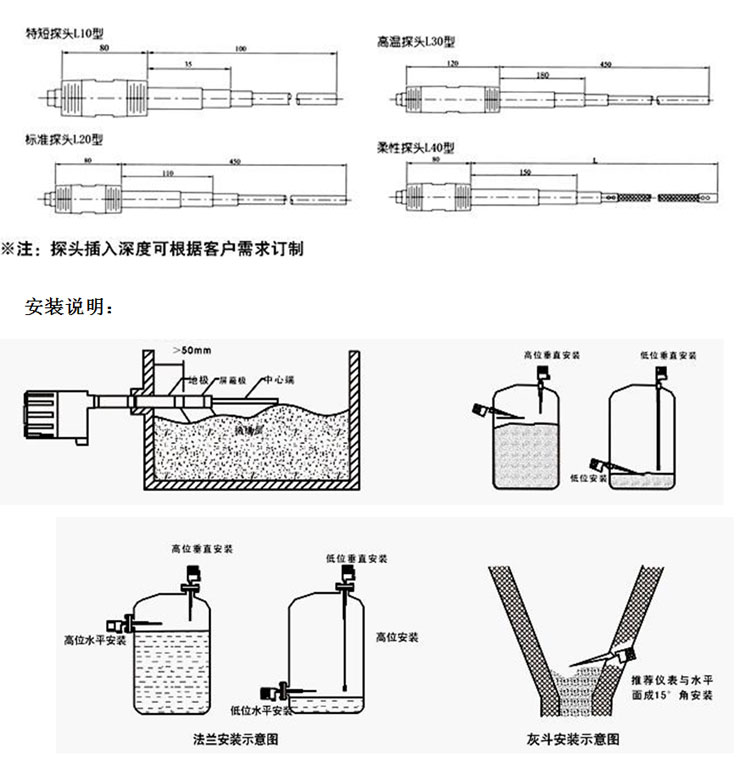 7.探頭安裝螺紋 1″NPT或法蘭安裝(特殊規(guī)格可訂制);